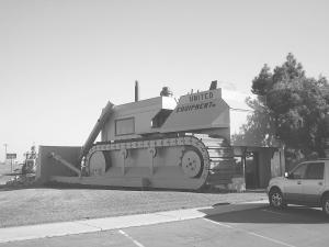 Giant Bulldozer Stops Travelers In Their Tracks AG WORLD Ag World I was driving to the World Ag Expo on busy highway 99 near Turlock California when I spotted a sight that makes motorists pull to the side of the road and grab their cameras To an untrained eye it looks like the worlds largest bulldozer ready for major dirt-moving action On closer inspection visitors are truly surprised to discover that the 40 by 70-ft long machine is actually a 1 700 sq ft office building My grandfather got this idea after seeing a huge tractor perched on a tower in Japan says Dustin Logsdon the third generation of his family to work for United Equipment His father Mitch owns the business which sells and rents heavy equipment The oversize bulldozer replica looks authentic in nearly every detail It s built to scale two-and-a-half times larger than a D8 Cat The tracks made of 3-in thick planks are 48 ft long nearly 12 ft tall and 9 ft wide The 38 by 18-ft tall dozer blade is a wooden frame covered in stucco Hydraulic lift and tilt arms are made from large well casings An air cleaner exhaust pipe the seat and lever controls are metal pieces painted black The large heap of rocks and rubble piled in front of the dozer blade are real Dustin Logsdon says the structure which is 2 1/2 stories tall took about seven months to build Carpenters had to spend many hours jig-sawing pieces into replica sizes to complete the building exterior Inside the main level is devoted to a reception area and three offices There s an entry door at the rear of the machine and a large patio door on the side The second level æengine compartment is a conference room with a large picture window that looks out to the main highway Space beneath the operator s seat is a separate office The exterior foot well is an open deck that continues across the back side of the second story screened from the road People all over know us by this building says Logsdon and that s been a real selling point We get visitors all the time just stopping in and we don t mind that at all Contact: FARM SHOW Followup Dustin Logsdon United Equipment Company 600 W Glenwood Ave Turlock Calif 95381 ph 209 632-9931; www unitedequipmentcompany com