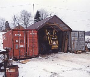 "We set the containers on railroad ties. The trick is to get them both square and level with each other. Then we welded steel tabs to the top edge and bolted 4 by 4's to them. This gives you a sill to attach rafters and a back wall. If you use two 40-ft. containers and leave 20 ft. between them, you'll have a very large and inexpensive space for storage. The containers are well-built and dry inside. They can be sealed and locked so we store all kinds of stuff in there."