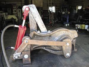 Gutschmidt built some heavy brackets on which to mount a 3-in. dia. by 8-in. stroke hydraulic cylinder.