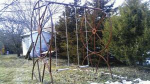 I built this sturdy swing from old telephone spools. I used one spool for the top half of each side and cut another in half for the bottom, and welded them together. I used a 2-in. pipe across the top with brackets on it for the chains to hook onto, and screw-in anchors to hold the swing to the ground.