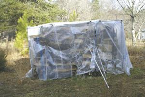He sets up a tent of clear reinforced plastic with 1 cord of firewood stacked inside. The plastic is attached with plastic cable ties to a frame made of metal tubing. An opening is cut into one side of the plastic. The corners of the frame are anchored in poured concrete.