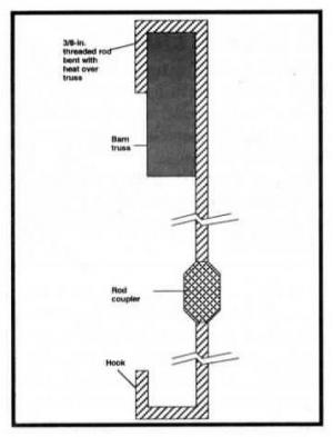 Richard Hayward, Birch Run, Mich.: "This is a handy idea I came up with for use in my pole shed. I make these `extra hand' hooks out of 3/8-in. threaded rod. I use heat to bend one end over the top of a wood truss and attach a hook to the bottom end with a rod coupler. You can make them any length and they're easy to move around and adjust up and down for height. I use them to hold lights, wrenches, hoses, buckets for livestock, and many other jobs."