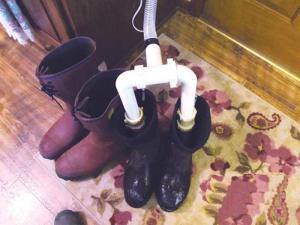 “I looked at boot dryers on the market, but decided I could make my own for less money,” he says. “I ended up using a portable hair dryer, the kind you use with a clear flexible hose and plastic bonnet.”