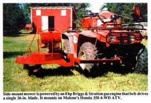 "It pivots up or down so I can mow along roadside ditches and it also reaches under fences," says Walter Malone, Dunlap, Iowa, about the side-mount mower he made for his Honda 350 4-WD ATV.