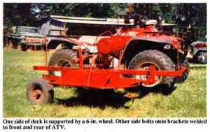 Malone used parts off old riding mowers to build the mower. It's powered by an 8 hp electric-start Briggs & Stratton gas engine that belt-drives a single 26-in. blade. One side of the deck is bolted to an angle iron frame that bolts onto brackets welded to the front and rear of the ATV. The other side of the deck is supported by a 6-in. wheel.
