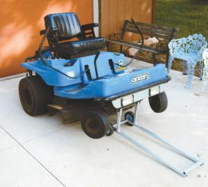The dolly is made from 1-in. sq., steel tubing and rides on two 6-in. rubber wheels. It measures about 36 in. long and 10 in. wide and has a pair of 9-in. long, horizontal lift fingers on front that are fitted with 2-piece metal brackets. The brackets form a cradle for a 1/2-in. dia. metal “lift rod” that Egleston bolted on under the front end of the mower.