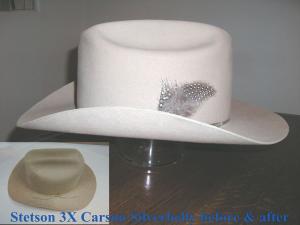 His Hobby Is Restoring Selling Old Stetsons FARM HOME Clothes “I’m always looking for old Stetsons I like to try and bring them back to life ” says Keith Betar The Texas ranch overseer has been around horses and worn hats all his life He appreciates quality hats like Stetson Resistol and Serratelli and finds satisfaction in restoring them to like-new condition And occasionally he adds embellishments of his own “It’s all done by hand ” Betar says explaining he modified a carpet shampoo steamer and mixes up non-chemical solutions to thoroughly clean the hats He brushes out dirt and stains with baking soda vinegar and water Once cleaned he shapes the hats Some hats get new feathers or a leather band but many look as they did when purchased new Betar explained that new Stetsons cost anywhere from $100 to $5 000 The quality rating is scored by X’s on the hat’s lining - the more X’s the better He keeps some of the hats for himself and friends and he sells others on eBay - often in the $50 to $75 range He also buys hats “I can tell by the lining the band and tag how old it is ” he says He paid $100 for a hat recently because of its age and quality Most of the hats he buys come from people in Nevada Texas and Arizona but he’s purchased hats from many other states as well based on photos and information sellers provide After cleaning and shaping them he sells them to buyers all over the U S as well as overseas to countries such as Great Britain Betar’s hat-fixing hobby has led to a small side service business With fewer Mom-and-Pop stores hat owners have a hard time finding someone to clean and shape their hats Between shipping and his time Betar charges about $50 for the service But his real passion is bringing old hats back to life for new owners who appreciate them “I don’t want to get real fancy ” he explains “I want to get them back where they were to what a horseman or rodeo rider would wear ” Contact: FARM SHOW Followup Keith Betar 35755 Singing Falls Dr Temecula Calif 92592 ph 951 767-0626; outwestranch@yahoo com