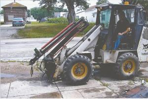 He attached it to a Bobcat 1600 front-end loader, but it would also attach to a skid steer.