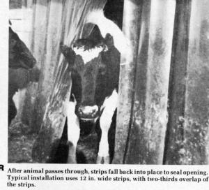Agriculture is constantly borrowing good ideas from industry and here's one that's starting to catch on fast, particularly with dairyman. It's a plastic strip door that cattle, people or equipment can move through, yet provides an effective barrier to cold air, rain, snow, birds, flies and other pests. It's completely self-opening and closing - animals, vehicles or people move right through it. As they do, the strips automatically fall back into place to completely and immediately seal the opening.