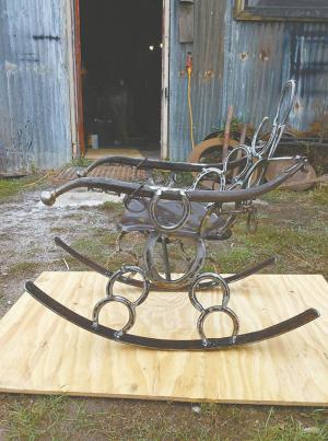 His work is so popular that he often runs out of raw material. He offers a $25 discount if a customer brings him a 5-gal. bucket of horseshoes.