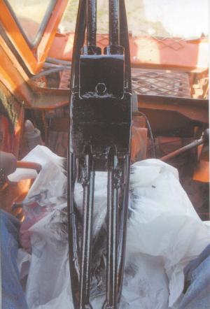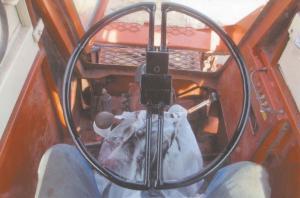 “I had to back my body into the cab and straddle my legs over the steering wheel before I could sit down. It was like getting into a skid loader,” says Buxengard. “I thought that if I could fold the steering wheel down to only a couple of inches wide, it would be a lot easier to sit down.”