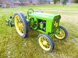 Buskirk used 42-in. spoke wheels on the rear and 18-in. spoke wheels on the front. The tractor rides on ribbed rear tires and smooth rib front tires. “I wanted to make the tractor look somewhat like an old Deere, so I made a nice hood out of sheet metal, with a smooth top 12 in. wide and 45 degree angled sides,” Buskirk says. The seat, steering wheel and steering mechanism are from an old Deere tractor.