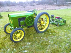 “I’ve had the tractor in several parades and people really enjoyed looking at it,” Buskirk says. The tractor has a small fuel tank under the hood, a 12-volt battery, electric start and floorboards to round out its authentic appearance. Buskirk uses it around his yard for summer jobs, including grass mowing with a 60-in. trail mower that he built from a 3-pt. machine. For that project he installed a 15 hp Briggs motor with a vertical motor in the center of the platform and made a carriage with 4 wheels so the mower glides easily over the lawn. He uses the two homemade rigs to mow his own 1˝ acre yard and also mowed a 20-acre field for the Big Rapids Antique Farm and Power Show. “The 3-blade mower does a nice job, and my home made tractor works great pulling it.” Buskirk says.
