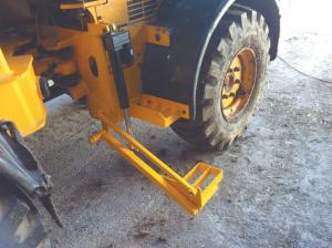 Martin Bell of County Durham added a hydraulic step to the side of his JCB tractor loader to help him climb in and out. He removed the original step, replacing it with a lift step made out of a couple pieces of square tubing and plate steel.