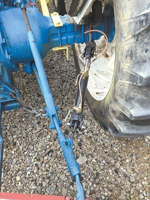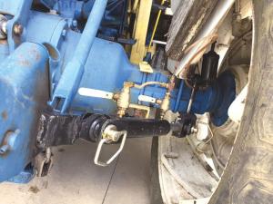 He bought a 2 by 8-in. stroke hydraulic cylinder equipped with a 3/4-in. dia. rod and attached one end to the tractor’s right rear axle and the other end to the right side lift arm. He also bought a pair of 3-pt. ball ends and welded one onto the lift arm and the other to the rod end of the cylinder. The rod-mounted ball end goes through a clevis that’s welded to an angle iron bracket at the bottom of the axle and is held on by a 3/4-in. dia. pin.