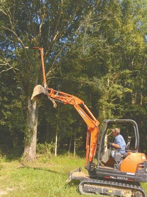 The backhoe-mounted Limbinator got its trial run at the dealership where a mechanic tested it cutting limbs around the shop. Smith’s first job with it was clearing out an area where he planned to dig a pond.