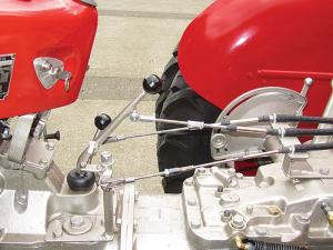 Aside from steering, other controls between the two tractors were linked mechanically. Jackson used custom levers added to the rear tractor with control cables to the OEM levers on the front tractor.