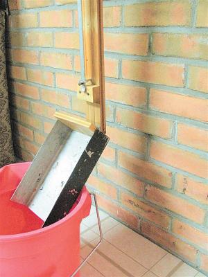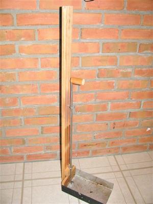 The device consists of a 3-ft. length of hardwood flooring with a 6 by 10-in. metal “dust pan” fastened to a hinge at the bottom. A long metal strap runs through a pair of I-bolts down to a wood block above the pan.