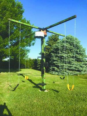 He was ready to build this spring after he obtained a 7 by 7 Deere cultivator toolbar for the upright. It’s secured in a 5-ft. deep hole filled with concrete, with 12 ft. of the toolbar above ground. He mounted the axle onto it along with the wheelchair wheel and motor, covered by the bottom of a barrel that protects it from rain.