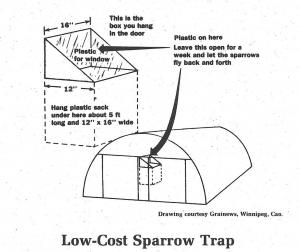 Low-Cost Sparrow Trap MISCELLANEOUS EQUIPMENT Pest Animals 7-4-6 I had lots of problems getting rid of sparrows. Not anymore. Catching them is easy with a box as shown in the picture. Open your quonset door 16 inches and put the box in the top of the door. Place plywood over the rest of the door, leave a hole open on top and let sparrows fly back and forth for a week or 10 days. Then close the hole with clear plastic and hang a plastic sack under it. As the sparrows fly out in the morning, they will hit the plastic window and drop in the sack, and are trapped.