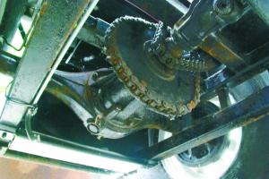 “I mounted a jackshaft with large and small sprockets on pillow block bearings alongside the driveshaft,” explains Christensen. “I cut the splined end off and welded a small sprocket on the driveshaft. I ran a roller chain from it to a large sprocket on the driveshaft stub coming out of the rear end.”