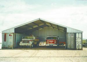 Lowell had one container and had seen buildings made with them. So another 40-ft. shipping container was purchased and leveled up 32 ft. from the first container. Because it was considered “portable” no permits were required to build the temporary fire station garage. A contractor installed a steel roof over the containers and built a partial back wall.