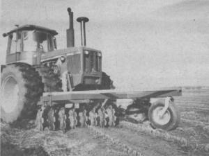 The triangular-shaped disk is fitted with a single castor wheel up front and raises and lowers hydraulically by hydraulic cylinders mounted on the tractor front. The two disk gangs - one in front of each set of tractor duals - run at sharp angles to the rows of stubble.