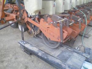 Richard Jagels, Buhl, Idaho, uses an old treadmill as a low-cost test stand to check the seeding rate on his Allis Chalmers corn planter.