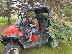 “The windshield folds down so we can get plenty of breeze when its hot. Flexible fabric door panels secure with clips and keep tools, toys or lunch boxes from sliding out while driving. The cost of this machine was a lot less than a comparable Deere and it has a 3-year power train warranty. I’m very satisfied,” Manthey says. “Side view and rear view mirrors provide good visibility to see what’s behind you when backing up or driving on the road. The lights are also very adequate for night visibility.”