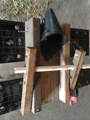 To build it, he used some scrap 2 by 6, 2 by 4, and 2 by 2 boards along with a piece of ˝-in. pvc pipe, a heavy-duty half gallon plastic nursery pot, electrical tape, and a piece of fence wire. The base of the unit is 8 ˝ in. wide by 16 ˝ in. long and easy to move around the farm. Next, he took the plastic pot and cut off the base, then cut it lengthwise and taped it into a cone shape with about a 1 ˝-in. hole at one end, and a 4-in. opening at the other. He fastened this with a screw and fencing staples to the base, making a cone where the piglet’s head rests during the castration process to keep them calm. On the back of the castration station, Howerton attached two “arms” made of 1-ft. long 2 by 2 boards with a screw loose enough to allow them to freely pivot, and drilled several holes to slide in a small pvc pipe restraining bar in place. Having several sizing options allows him to adjust it for the size of the piglet he is castrating (up to 25 lbs.). A piece of fencing wire attaches to the pipe and once the piglet is laying in the castration station on its back, the pvc restraining bar goes down over the piglet’s rear legs and the wire wraps around a screw at the top of the castrator unit to keep it secure during the process.