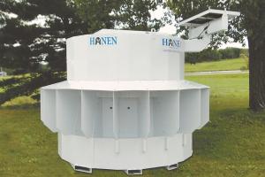 Solar-Powered Automatic Cattle Feeder LIVESTOCK Feeding Equipment A new cattle feeder tells cattle when to eat by emitting an audio signal doing so multiple times throughout the day Dave Barney president of Service Line was looking for a better way to feed his own cattle and the Automatic Solar-Powered Cattle Feeder was the result “We built the first unit to handle smaller herds of up to 10 full-size animals ” says Steve Meyer of Service Line “The demand was there so we added a larger unit for herds of up to 20 head The feeder can handle greater numbers if feeding calves or smaller size animals ” The smaller feeder is 6 ft wide 9 ft long and 8 ft tall The larger one is circular in design with an 8-ft diameter and an 8-ft height Both feeders have hopper capacities of 3 000 lbs Ask for Barney to discuss price The Hanen feeders are fabricated from heavy-duty steel and are 100 percent powder-coated for durability Individual calf guards can be installed Optional vision blockers are also available ensuring separate feeding stations for each animal An attached battery is recharged by a solar panel making the programmable feeder fully portable It’s designed to be picked up and moved by a tractor with forks Once in place it can be programmed to deliver desired amounts of feed up to 6 times per day “I’m dedicated to providing controlled nutrition that results in high-quality animals ” says Barney The company points to studies that show a balanced diet evenly distributed throughout the day creates a calmer animal on less feed without sacrificing growth Contact: FARM SHOW Followup Service Line Inc 2320 Zinga Dr Reedsburg Wis 53959 ph 608 524-0204 or 800 774-7900; www automaticcattlefeeder com