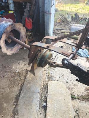 He used truck leaf springs and scrap metal to build a frame, bending the springs down at a 90 degree angle. The auger reduction gear was originally fastened to a big steel plate, which Zigler cut off and welded to the springs. The reduction gear drives a 2-in. dia. pipe that’s fastened to a small metal plate, which has bolts welded onto it to support the wheel rim. He widened the rim by cutting the center out of a pair of disc blades and welding one onto each side of the rim.