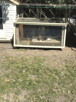 “Dad built it a couple of years ago. It lets our Beagle look out and see everything that’s going on outside, while also staying warm,” says Jack. “There’s a big bed inside that rests on a floor covered by an old carpet.”