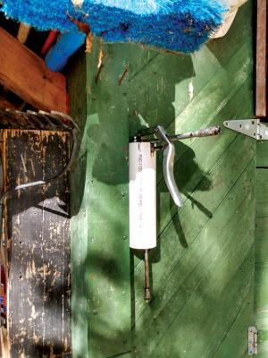 John Matthews, Chapin, S.C.: “A short length of pvc pipe serves as a holder that keeps my mini grease gun handy right outside my storage shed. I cut a slot in one end of the pipe to accommodate the handle and then screw the pipe to the shed wall.”