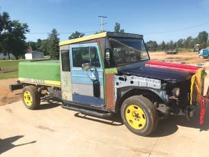 He replaced the truck cab with a cab from a 6600 Deere combine, setting it in place over the dash so he would still have a radio, heat and air conditioning. The doors would have been awkward to climb out of, so he replaced them with doors from a Peterbilt semi-tractor.