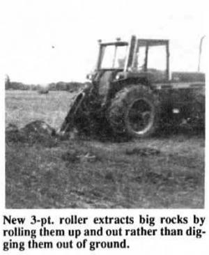 Stone Roller rolls rocks out of ground ROCK PICKERS Rock Pickers 15-6-3 "People can't believe the way it rolls big rocks right up out of the ground, leaving a hole only as big as the rock itself," says Roland Brouzes of Brouzes Welding who's come up with a new "stone roller" for tractor 3-pts. that extracts big rocks by rolling them up and out rather than digging them out of the ground with a dozer or other type of rock digger. It also works great to dig out stumps.