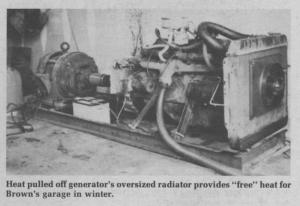 The entire generator system consists of a 250 cu. in. auto engine, with an oversize radiator (he pulls heat off it with a fan to heat his garage), the converted 3-phase motor, and a rear axle shaft from a Volkswagen that connects the two. In addition to generating electricity and heating his garage, he has plans to heat hot water for his house with heat off the engine.