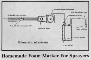 The marker, which fits on his 40 ft. sprayer for covering wheat ground, consists of a hydraulic motor (bought new) which plugs into tractor hydraulics and powers an air compressor salvaged from a car air conditioning unit. An air line runs to the foaming solution tank. Foam bubbles out of the tank and through a 1-in. hose to a collector at the end of the boom.