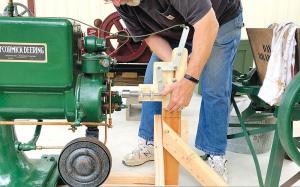 But Miller took it a step further and built a “Third Hand” that pushes the intake valve while turning the flywheels to get the engine spinning. He mounted it on a wood frame that can be adjusted to different heights to work on all engines.