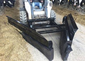 Mensch scrapers have a universal bucket attachment and come in stationary, rotating, and V-blade designs. Stationary blades are available in 6 ft., 6 in. and 7 ft., 11 in. widths. The 7-ft., 5-in. rotating blade moves feed to the left or right and is available in hydraulic or manual models. The V-blade has a 7 ft., 11 in. width. They range in price from $3,735 for the stationary blade to $4,350 for the V-blade.