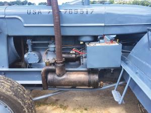 Brown disassembled the locked up and rusty engine, tore apart the transmission and brakes, and then rebuilt them all using parts from the I-9 Standard. He fabricated parts for the exhaust system that extends across the hood and down into a water bath spark arrestor. Excellent details were shown in the manual. He says the exhaust was built that way, so the tractor was safe for hauling fuel and trailers filled with explosives.