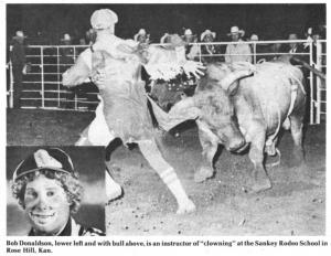 Donaldson also is an instructor at the Sankey Rodeo School of Rose Hill, Kan., near Wichita. At the weekend school, operated by C. L. "Bud" Sankey and Ike Sankey, you can study not only bullfighting and clowning but also bull riding, bareback riding, and bronc riding.