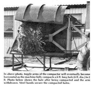 The accompanying photos show a prototype compactor designed and built by Iowa State University students enrolled in a design course taught by Dr. Buchele. It features a double toggle mechanism connected together by two double acting hydraulic cylinders which serve as the driving link to compress bales 6 ft. long and 6 ft. in dia. to only 2 ft, long.