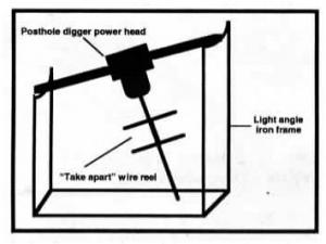 Home-Built Wire Winder FENCING Miscellaneous 19-2-36 I made a wire winder for smooth electric fence wire that has saved me many hours of labor. I had a gas driven portable post hole digger and used the power head from it. The power head sits in U-shaped brackets on a light angle iron frame. By removing one shear bolt and taking apart the wire reel, then tying the spools together they can be replaced for rolling out or the spool can be taken off of rewinder for unrolling later. This winder will pull in 1/2 to 3/4 mile of wire in a few minutes. I usually set the roller on the ground and drive two electric fence posts through tabs on bottom of the frame to anchor it. I use a heavy pair of leaher gloves to guide wire to roll evenly onto spool.