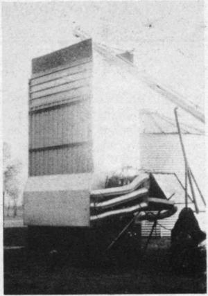 The dryer combines features from commercial units with Glynn's own ideas. Corn is augered into the top of the unit and divided into two streams. The corn falls over perforated metal sections through which warm air is forced. Glynn explains that his dryer can dry 100 bu. of corn from 30% moisture down to 17% in one hour. He notes that larger capacity dryers could easily be built.