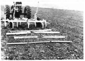 For greater flexibility, he attached two 2-in. dia. steel pipes to the front edge of the drag (instead of using one pipe all the way across). The pipes hook to an oak 2 by 4 which is hitched by chain to the back of the plow. At the back of the drag, he attached three 2-in. dia. pipes, again to allow flexibility as it passes over clods or uneven ground. When more weight is needed on particularly cloddy ground, he ties fence posts to the front and middle of the drag.