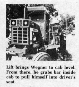 The hydraulically-powered platform gently lifts Wegner from ground level to the threshhold of his tractor cab. From there, Wegner is able to grab handholds and a bar inside the cab to hoist himself into the driver's seat. Once in the seat, he is able to operate the clutch and brakes with his hands, using special designed levers fitted to normally footoperated controls.