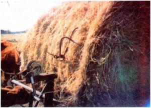 Hammond backs the trailer up against a bale lying in the field and pulls the winch cable out over the bale. He then pushes the hay hook into the back side of the bale at a point about 2 ft. above ground level. The points of the hook, which go into the hay about 6 in., must be sharp to penetrate.
