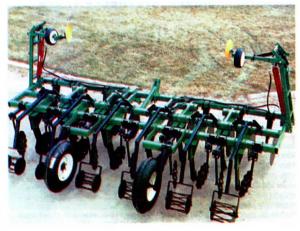 The second bar on the triple toolbar is fitted with 4 subsoiler shanks that mount directly behind the tractor tires to break up compaction. The third bar has subsoiler shanks that run in each row to be planted. The two wavy coulters behind each shank move soil back into the grooves created by the shanks, and also cut more trash.