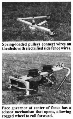 Invented by an Argentine cattleman and in testing by USDA researchers in Oklahoma, the new "frontal grazing system" is a fence that cattle can move on their own. It consists of two strands of wire strung across moveable sleds. The upper wire is electrified while the lower one is insulated. Cattle graze up against the wire and as they clean up the available forage, nudge the wire with their necks moving the sleds backward into new territory.